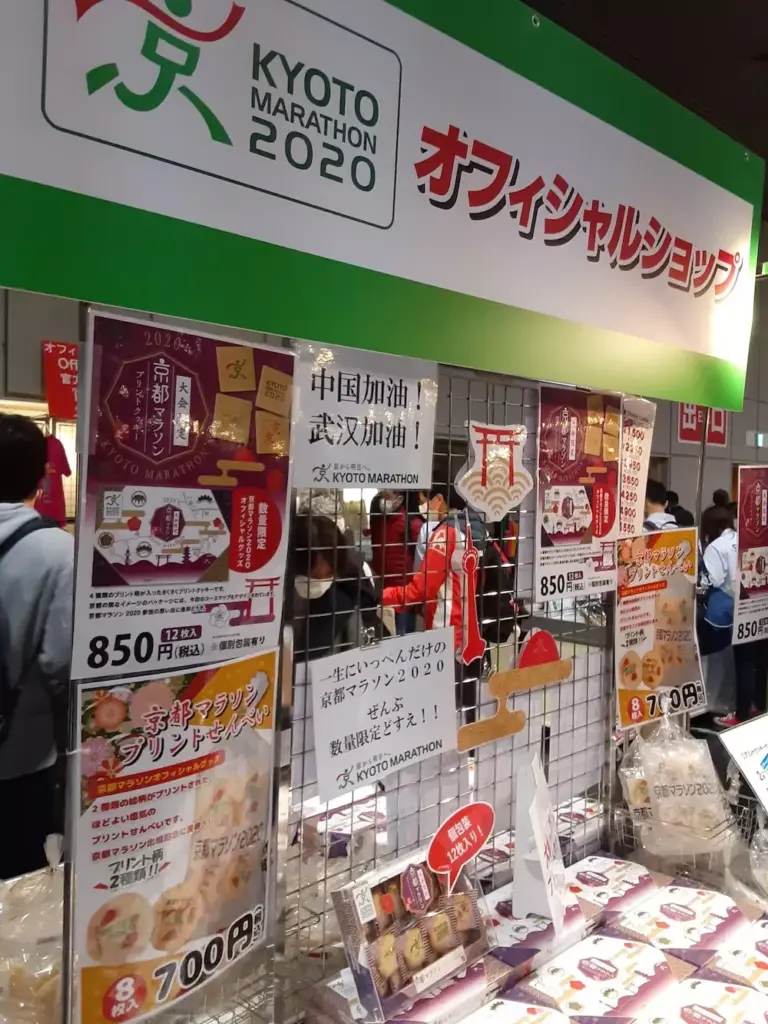 2月16日に開催された「京都マラソン2020」では、オフィシャルグッズの企画・販売を当社でしていました。「武漢加油!(がんばれ)」という看板も掲げて、マスクこそしている人が多かったものの会場も大盛況でごった返していました。